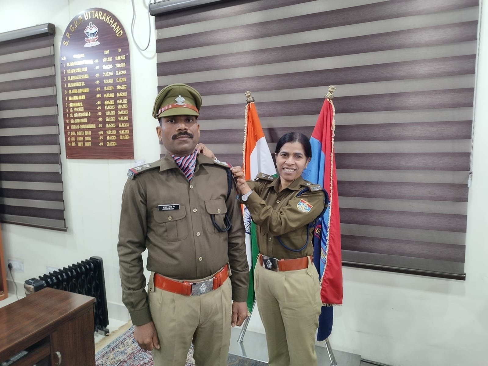 सेवा नियमावली में निहित प्राविधानों के अनुसार मुख्य आरक्षी से अपर उपनिरीक्षक के पद पर प्रोन्नत के परिपेक्ष्य मे आज एस0पी0 जीआरपी अरुणा भारती द्वारा क्रमशः थाना जीआरपी हरिद्वार व थाना जीआरपी देहरादून में तैनात श्यामदास व नरेन्द्र कुमार को आज दिनांक 02/01/2026 को मुख्य आरक्षी से अपर उपनिरीक्षक के पद पर पदोन्नत होने पर कंधों पर स्टार “बैच” लगाये गये ।