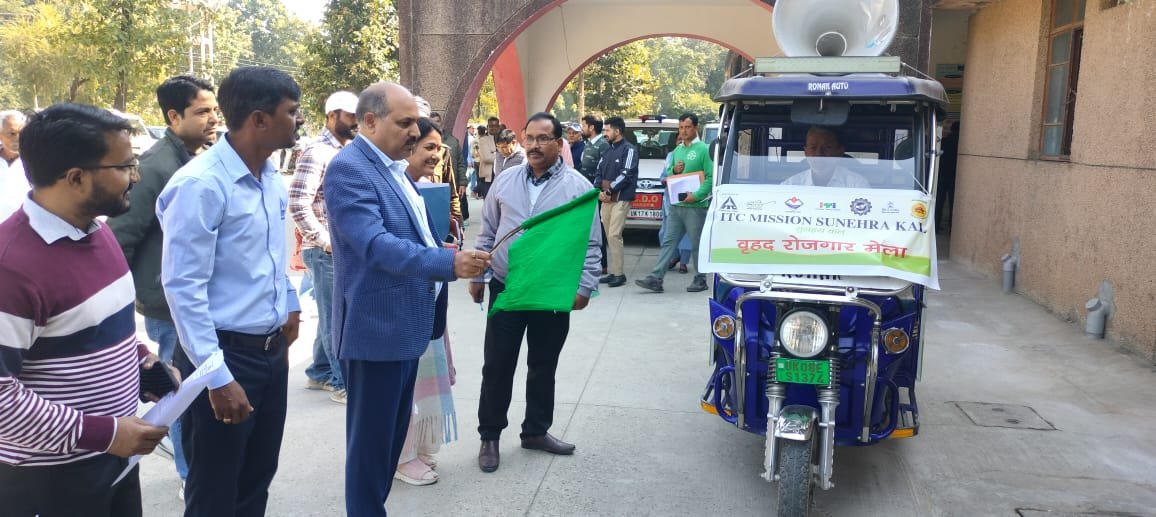 हरिद्वार,      मुख्य विकास अधिकारी ललित नारायण मिश्र ने अवगत कराया है कि जनपद के बेरोजगार युवाओं को रोजगार के अवसर उपलब्ध कराने के लिए आईटीसी मिशन सुनहरा कल तथा जिला कौशल विकास एवं सेवायोजन कार्यालय, हरिद्वार के मार्गदर्शन एवं नेतृत्व में दिनांक 21 नवंबर 2025 को दयानंद स्टेडियम गुरुकुल कांगड़ी विवि हरिद्वार में वृहद रोजगार मेले का आयोजन किया जा रहा है,जिसके सफल क्रियान्वयन के लिए प्रचार वाहन को हरी झंडी दिखाकर रवाना किया।