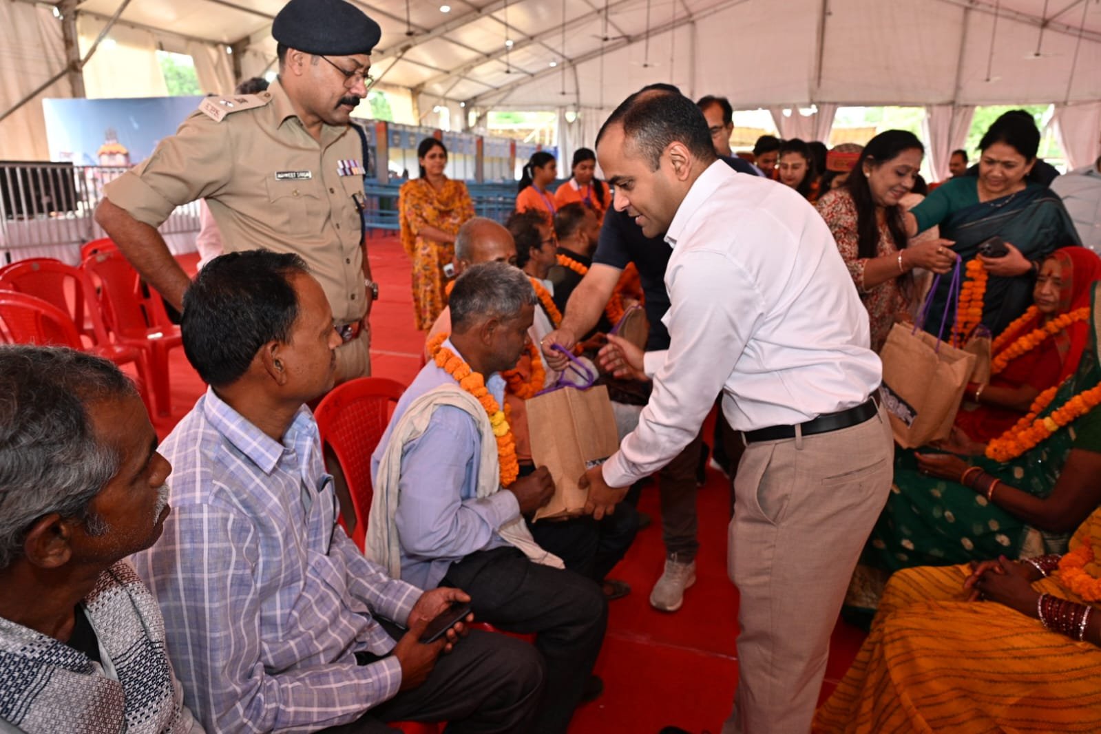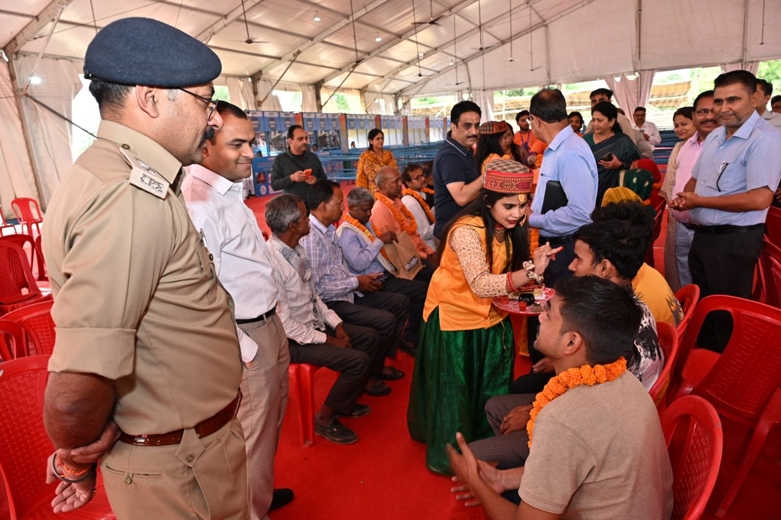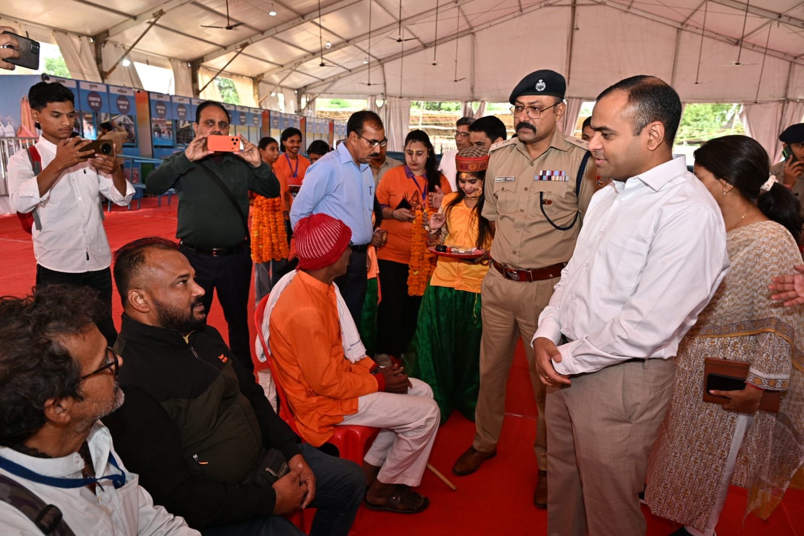 अतिथि देवो भव की परम्परा से फूल मालाओं एवं टिका चंदन से जिलाधिकारी मयूर दीक्षित एवं वरिष्ठ पुलिस अधीक्षक  नवनीत सिंह भुल्लर ने किया गया तीर्थ यात्रियों का स्वागत