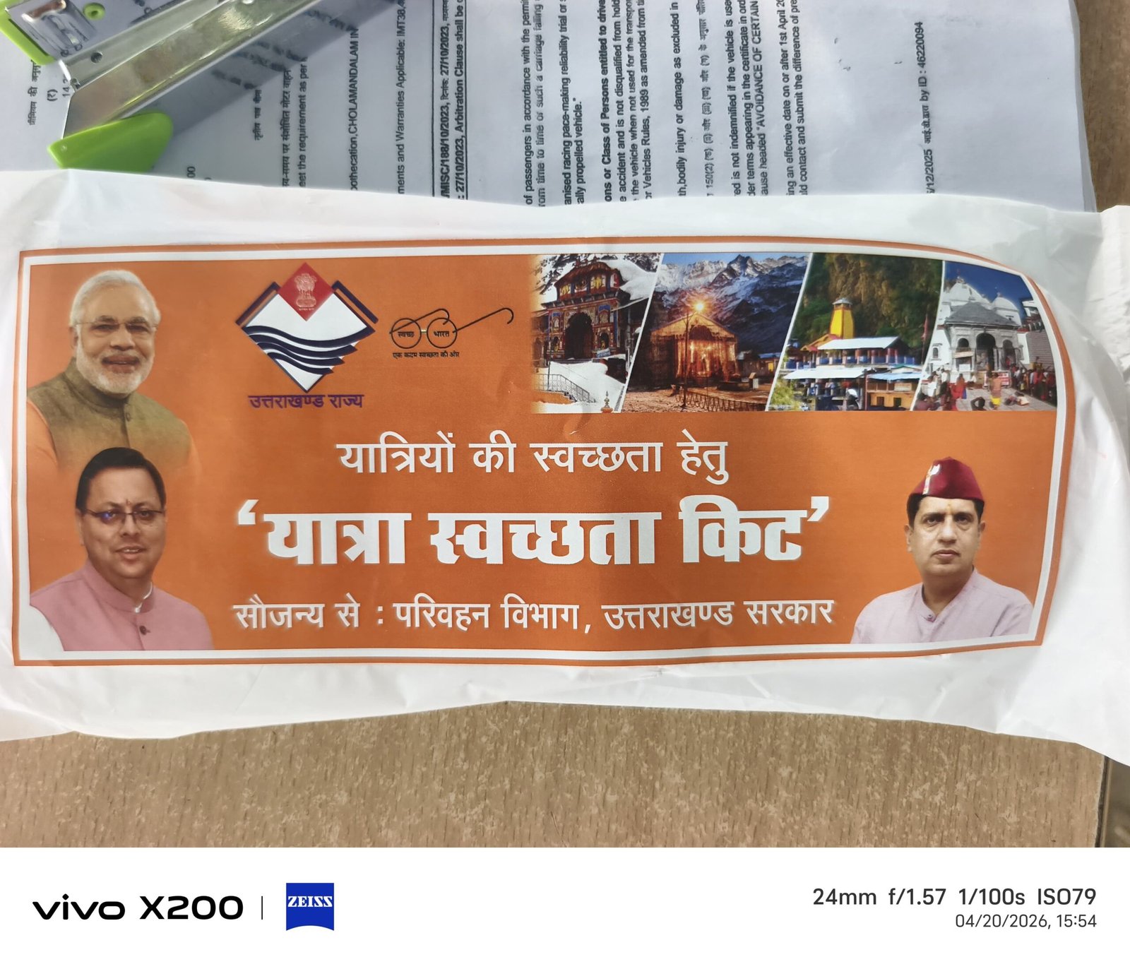*हरिद्वार ।    चारधाम यात्रा 2026 के दृष्टिगत यात्रियों की सुरक्षा, स्वच्छता एवं सुविधा को प्राथमिकता देते हुए एक अभिनव पहल के अंतर्गत यात्रा सुरक्षा किट का वितरण प्रारंभ किया गया है। यह किट उन सभी वाहनों को प्रदान की जा रही है जो ग्रीन कार्ड बनवाकर चारधाम यात्रा के लिए प्रस्थान कर रहे हैं।