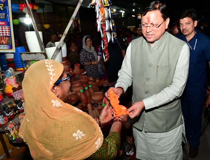 मुख्यमंत्री पुष्कर सिंह धामी ने आज अपने गृह क्षेत्र खटीमा में ‘स्वदेशी अपनाओ’ अभियान के तहत पारंपरिक मिट्टी के दियों और स्थानीय रूप से निर्मित वस्तुओं की खरीदारी की।