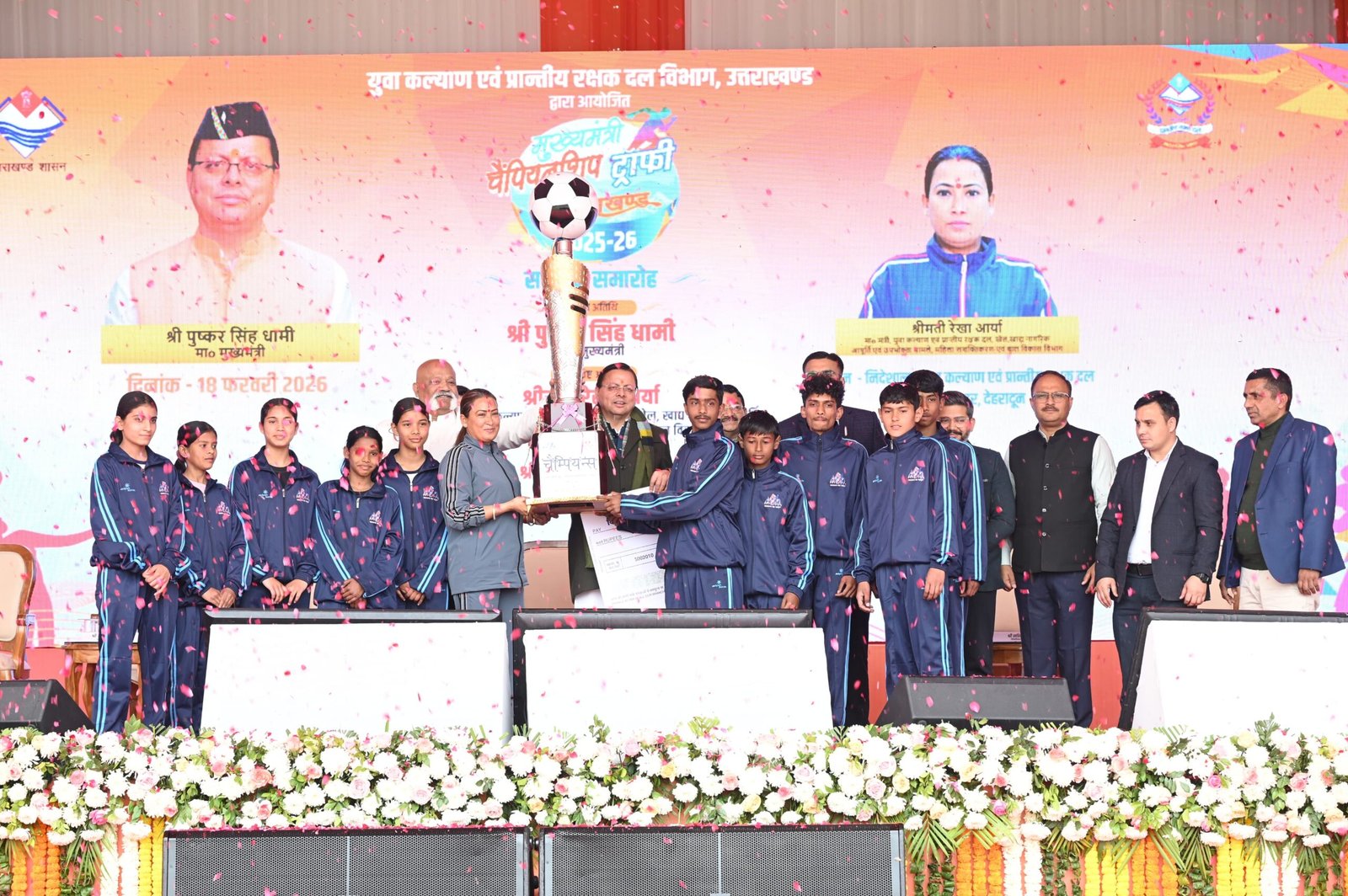 मुख्यमंत्री श्री पुष्कर सिंह धामी ने बुधवार को ननूरखेड़ा, देहरादून में मुख्यमंत्री चैम्पियनशिप ट्रॉफी 2025-26 के समापन समारोह में प्रतिभाग किया। इस अवसर पर मुख्यमंत्री ने देहरादून जनपद को विजेता ट्रॉफी एवं 05 लाख रुपये का चेक प्रदान किया।
