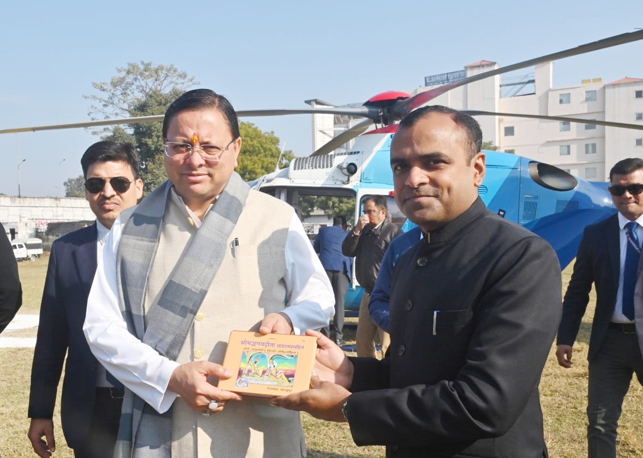 हेलीपैड दयानन्द स्टेडियम गुरुकुल कांगड़ी पहुंचने पर जिलाधिकारी मयूर दीक्षित एवं वरिष्ठ पुलिस अधीक्षक प्रमेंद्र सिंह डोभाल ने श्री भगवत गीता भेंटकर स्वागत किया एवं भाजपा पदाधिकारियों एवं कार्यकर्ताओं द्वारा पुष्प मालाओं के साथ स्वागत किया।