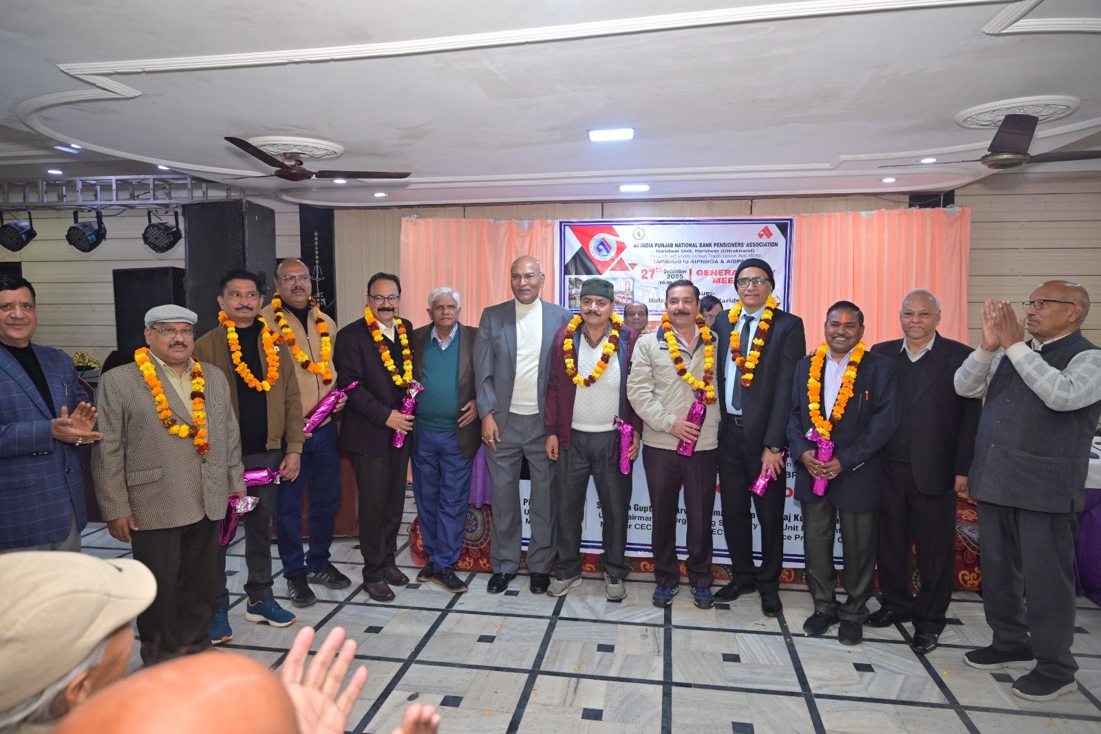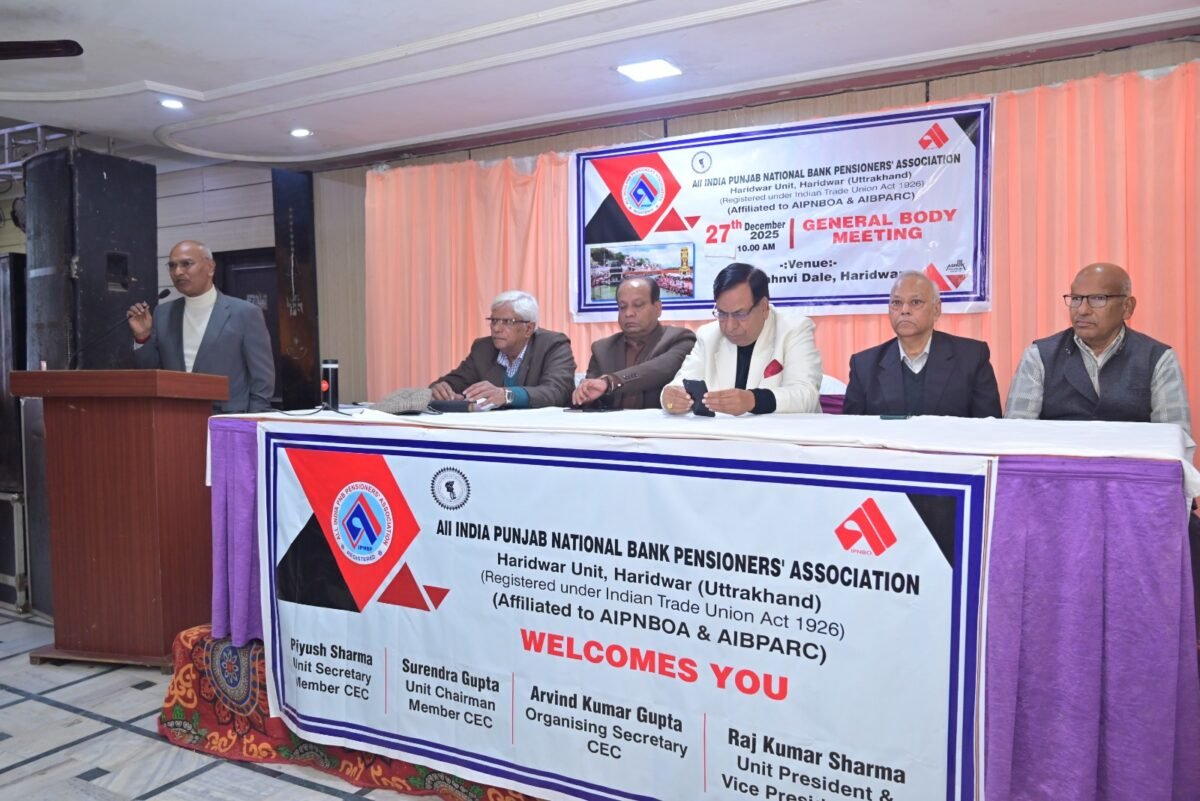 हरिद्वार। ऑल इंडिया पंजाब नेशनल बैंक पेंशनर्स एसोसिएशन हरिद्वार मंडल की जनरल बॉडी मीटिंग बड़े धूमधाम से जाह्नवी होटल में शनिवार को आयोजित की गई। कार्यक्रम को औपचारिक रूप से प्रारंभ करते हुए सचिव श्री पीयूष शर्मा जी ने यूनिट उपाध्यक्ष श्री सुरेंद्र कुमार एवं श्री राजकुमार सक्सेना, चेयरमैन सुरेंद्र गुप्ता जी, केंद्रीय संगठन सचिव श्री अरविंद गुप्ता जी एवं केंद्रीय उपाध्यक्ष एवं हरिद्वार यूनिट अध्यक्ष श्री राजकुमार शर्मा जी को मंच पर आमंत्रित किया। कार्यक्रम का शुभारंभ उपस्थित सम्मानित अतिथियों के द्वारा माता सरस्वती की मूर्ति पर माल्यार्पण द्वारा एवं दीप प्रज्वलित करके किया गया।