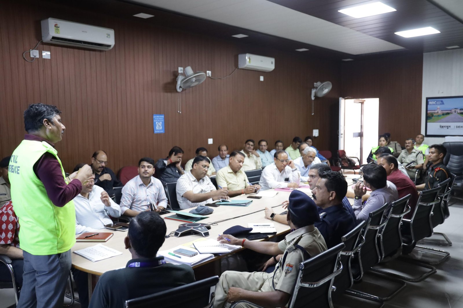 देहरादून नागरिक नागरिक सुरक्षा एयर रेड/ब्लैक आउट के सम्बन्ध में महानिदेशालय अग्निशमन सेवा, नागरिक सुरक्षा एवं गृहरक्षक, गृह मंत्रालय भारत सरकार द्वारा निर्धारित एसओपी के अनुसार 24 अपै्रल 2026 को रात्रि में 10 बजे आयोजित की जाने वाले मॉक अभ्यास के सम्बन्ध में जिलाधिकारी/ अध्यक्ष जनपद आपदा प्रबन्धन प्राधिकरण सविन बसंल के निर्देशोंके अनुपालन में सम्बन्धित रेखीय विभागों के अधिकारियों के साथ एनआईसी सभागार में टेबल टॉप बैठक आयोजित की गई। बैठक में रेखीय विभाग एवं तहसील स्तर पर (तहसील सदर) गठित आईआरएस नामित अधिकारी उपस्थित रहे।