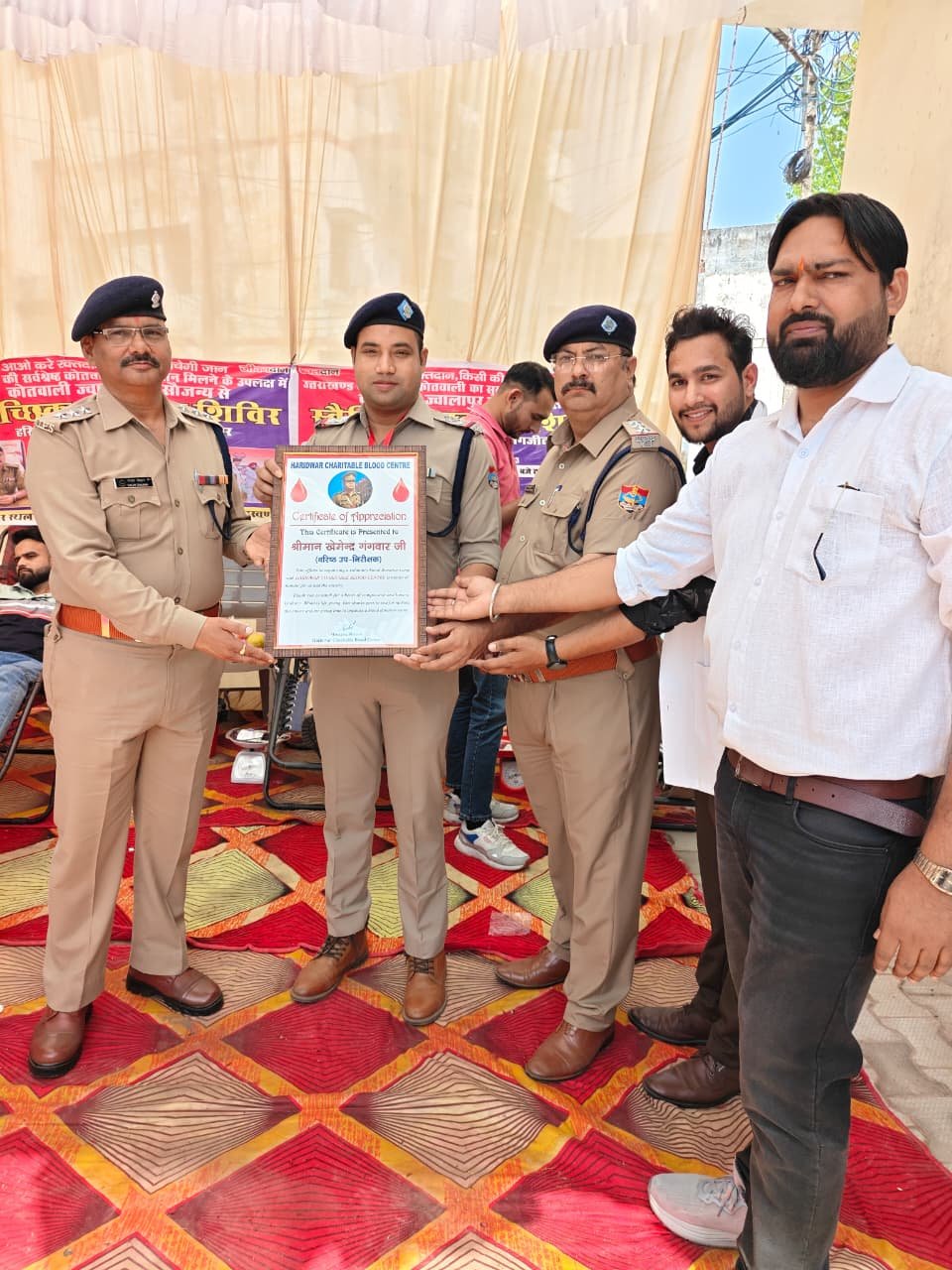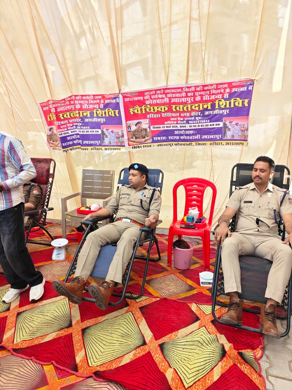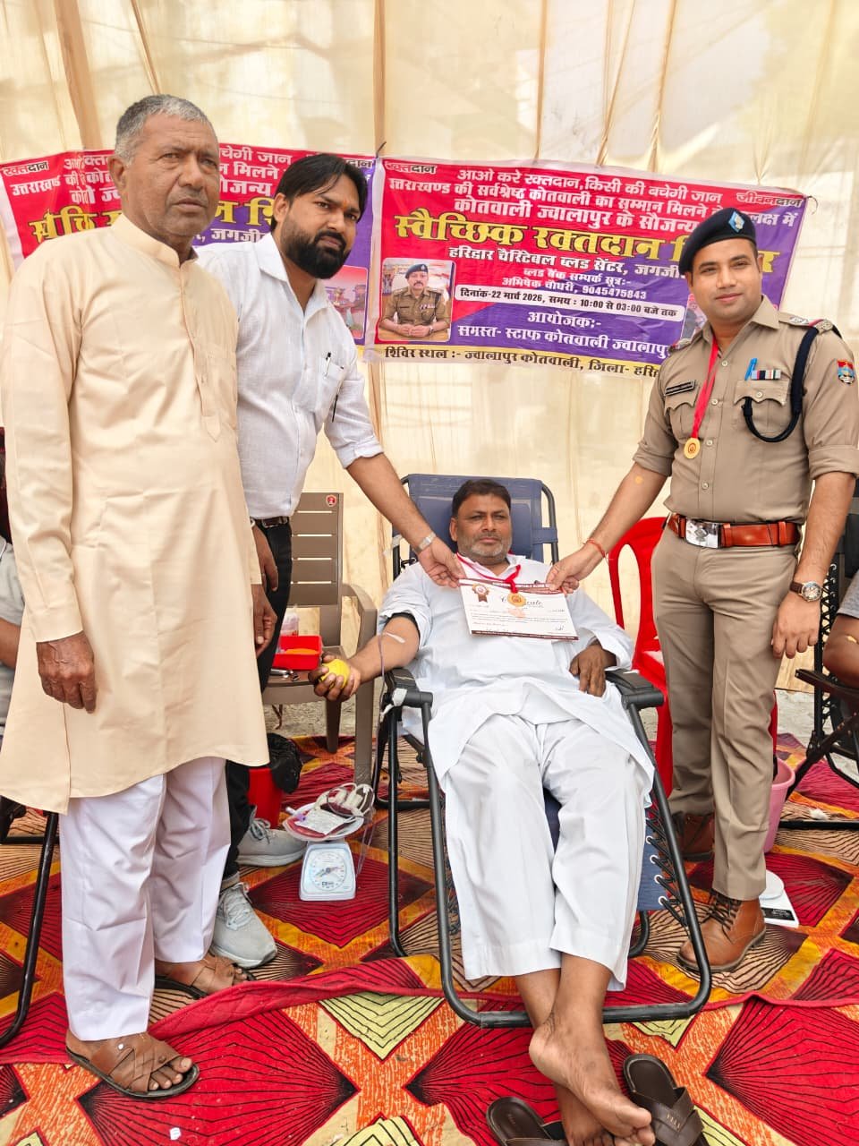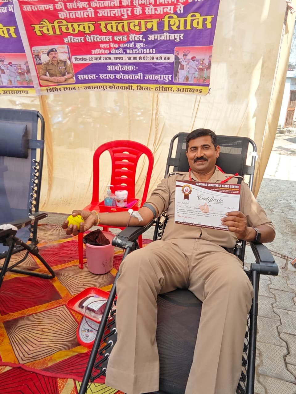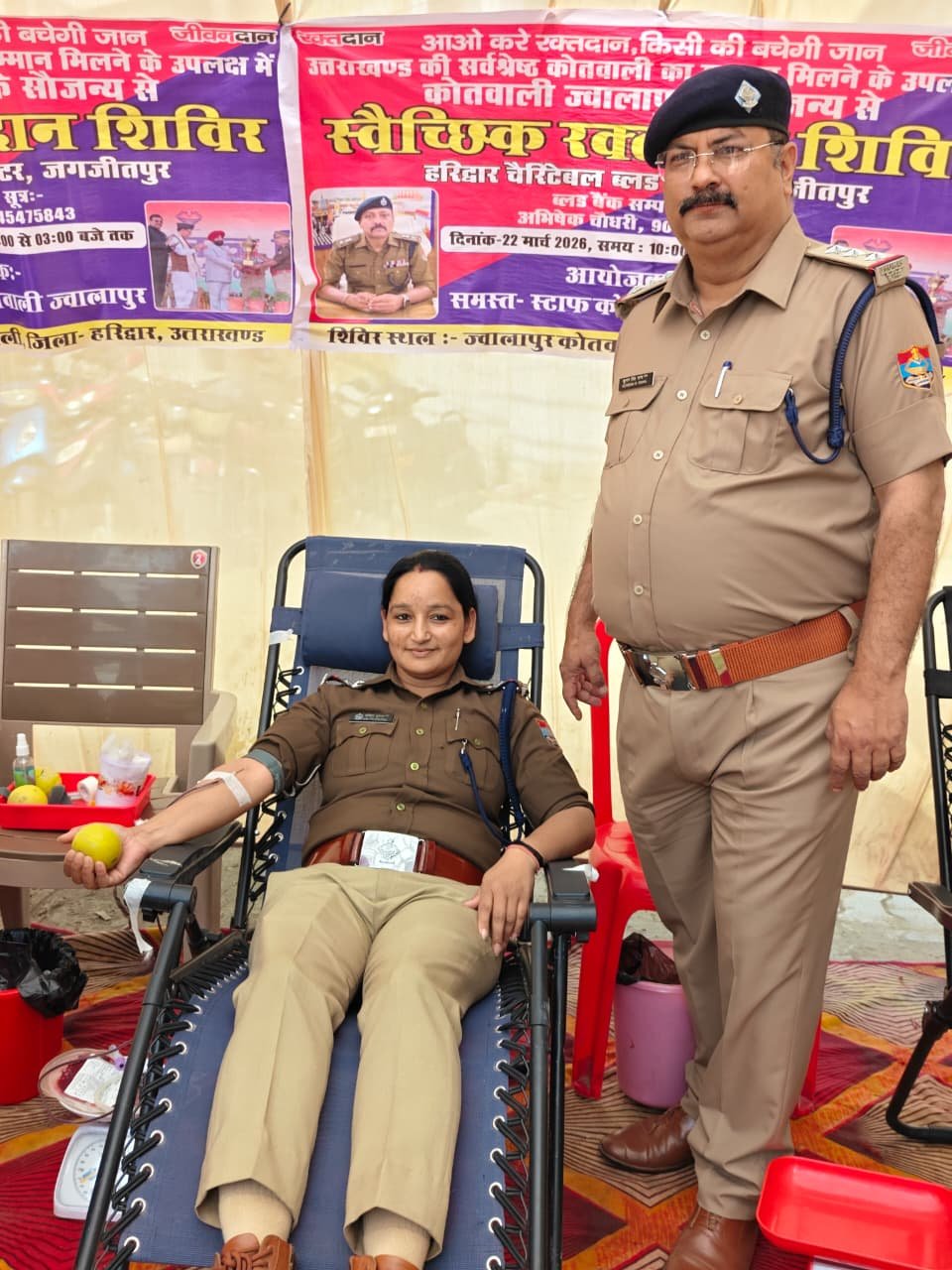 उत्तराखण्ड की सर्वश्रेष्ठ कोतवाली का सम्मान प्राप्त होने के उपलक्ष्य में, वरिष्ठ पुलिस अधीक्षक हरिद्वार के नेतृत्व में प्रभारी निरीक्षक कोतवाली ज्वालापुर एवं व0उ0नि0 खेमेन्द्र गंगवार की पहल पर दिनांक 22-03-2026 को स्वैच्छिक रक्तदान शिविर का आयोजन किया गया।