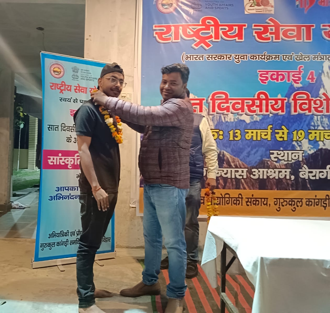 उन्होंने मताधिकार एवम निर्वाचन के बारे में छात्रों को जानकारी दी। इस दौरान सहायक युवा कल्याण अधिकारी मुकेश भट्ट ने शिविर में स्वयंसेवको के द्वारा किए जा रहे विभिन्न कार्यक्रमों की सराहना की। सांस्कृतिक सत्र का शुभारभ इलेक्ट्रिकल विभाग के बृजेश कुमार ने किया।