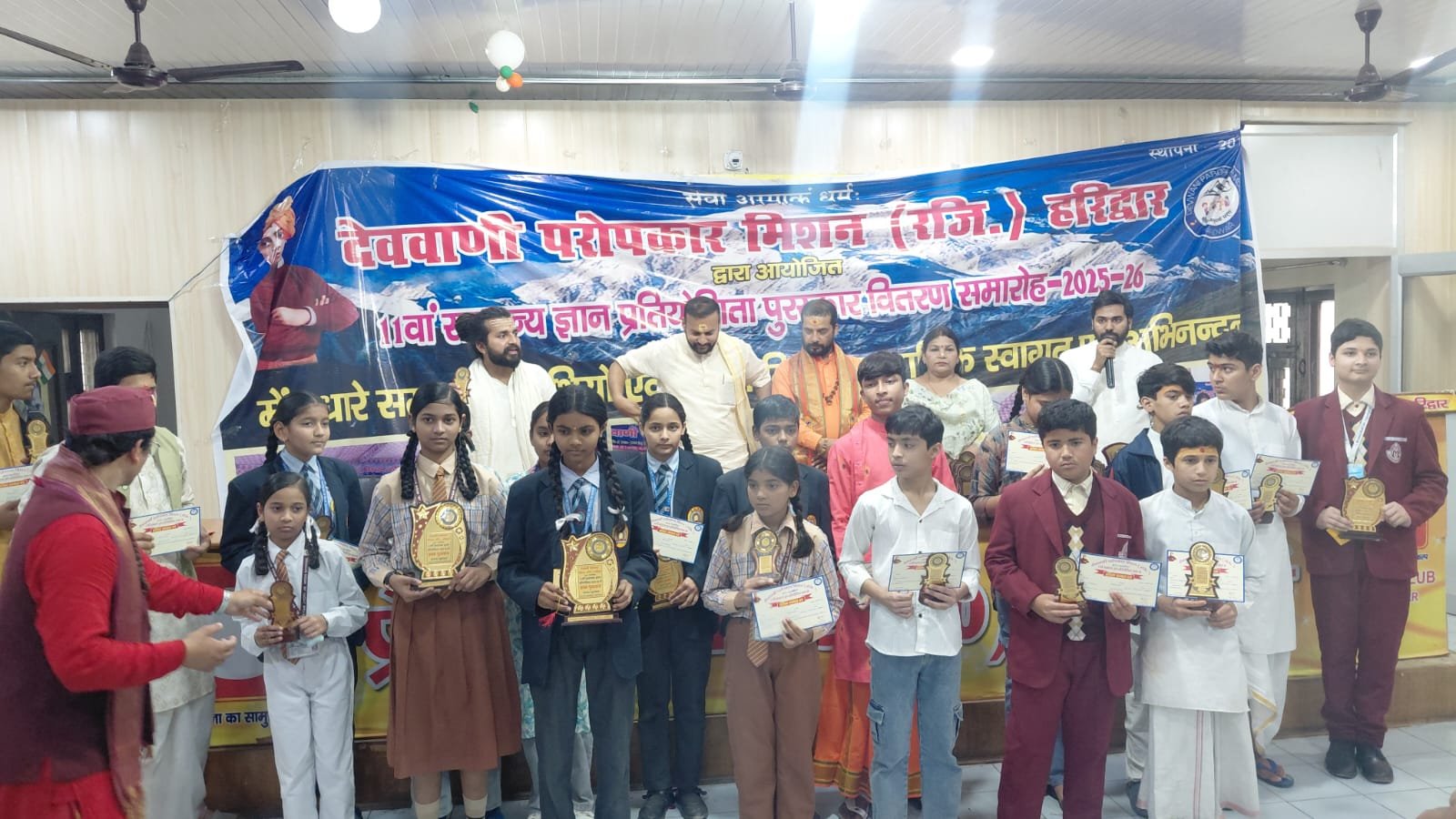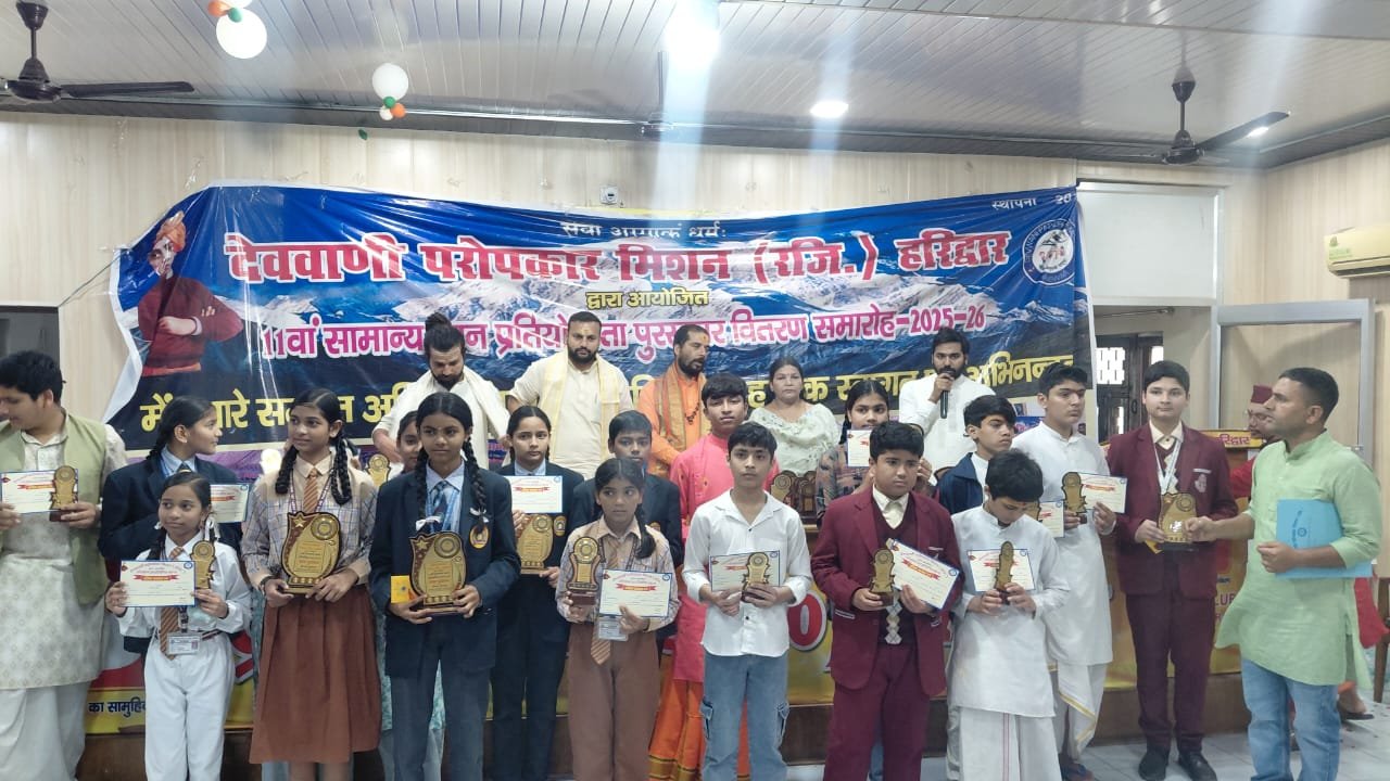 हरिद्वार।आज देववाणी परोपकार मिशन हरिद्वार द्वारा 11 वां सामान्य ज्ञान प्रतियोगिता 2025 ,26 प्रेस क्लब हरिद्वार में पुरस्कार वितरण किया गया देववाणी परोपकार मिशन के अध्यक्ष ईश्वर सुयाल ने बताया कि सामान्य ज्ञान प्रतियोगिता में प्रथम द्वितीय तृतीय छात्र-छात्राओं को नगद पुरस्कार एवं शील्ड प्रमाण पत्र देकर सम्मानित किया गया जिसमें प्रथम स्थान आलोक पांडे वेद विद्यार्थी देहरादून जया रेडियंट पब्लिक स्कूल द्वितीय स्थान प्राची भारद्वाज सिवा नेशनल स्कूल भव्य कानेकर ,साध्वी आनंद ज्योति स्कूल ने संयुक्त रूप से तृतीय स्थान राशि अग्रवाल चेतन ज्योति जूनियर हाई स्कूल ,सारांश कौशिक भागीरथी विद्यालय हरिपुर ने संयुक्त रूप से प्राप्त किया प्रतिभागियों को संयुक्त रूप से क्रमशः 5100,₹2100 और ₹1100 नगद पुरस्कार प्रदान किया गया इसके साथ ही हिमालयन अकैडमी हिमांगी, अंशिका , दून पब्लिक स्कूल के गुंजन सिंह, गिरीश चंद्र रवाली, हरि भारती संस्कृत विद्यालय में राहुल भट्ट ,सरोज ,आयुष गॉड शिव नेशनल स्कूल से स्नेहा गुप्ता ,प्राची भारद्वाज आयुषी जोशी सप्त ऋषि संस्कृत विद्यालय से रवि पांडे ,रोशन कुमार दुबे भागीरथी विद्यालय सार्थक राणा को मंच पर शील्ड प्रमाण पत्र देकर सम्मानित किया गया इस मौके पर कार्यक्रम में मुख्य अतिथि हरिद्वार नगर निगम महापौर श्रीमती किरण जैसल ने कहा कि छात्र-छात्राओं में स्कूली ज्ञान के साथ-साथ सामान्य ज्ञान होना बहुत जरूरी है इससे छात्रों को एक मंच मिलता है और अपनी प्रतिभा साबित करने का अवसर होता है जो आने वाले प्रतियोगी परीक्षाओं में उनके लिए मील का पत्थर साबित होगी उन्होंने ऐसे आयोजन पर देववाणी परोपकार मिशन को शुभकामनाएं दी गरीब दासी आश्रम के अध्यक्ष स्वामी रवि देव शास्त्री ने कहा कि हिंदी संस्कृत सामान्य ज्ञान प्रतियोगिता से छात्र-छात्राओं में प्रतिस्पर्धा का मार्ग खुलता है छात्रों को अध्ययन अध्यापन के साथ सामान्य ज्ञान बहुत जरूरी है आज के इस भौतिक आधुनिक युग में पूरे विश्व भर की खबरें हर किसी को पता होना चाहिए इस मौके पर युवा भारत साधु समाज के राष्ट्रीय अध्यक्ष शिवम महंत ने कहा कि संस्कृत हिंदी सामान्य ज्ञान प्रतियोगिता बहुत ही उपयोगी है जहां छात्रों को संस्कृत और हिंदी अंग्रेजी सभी माध्यमों के छात्रों को एकजुट होकर परीक्षाएं देनी हो रही हैं इस अवसर पर कार्यक्रम अध्यक्ष ईश्वर सुयाल ने सभी का अभिनंदन स्वागत किया इस मौके पर विनय यादव मोहित जोशी नवीन सुयाल राहुल भट्ट स्नेहा गुप्ता राजवीर सिंह मुकेश सैनी प्रदीप कुमार कमल किशोर प्राची देवी गुंजन सिंह आयुषी जोशी आदि उपस्थित रहे