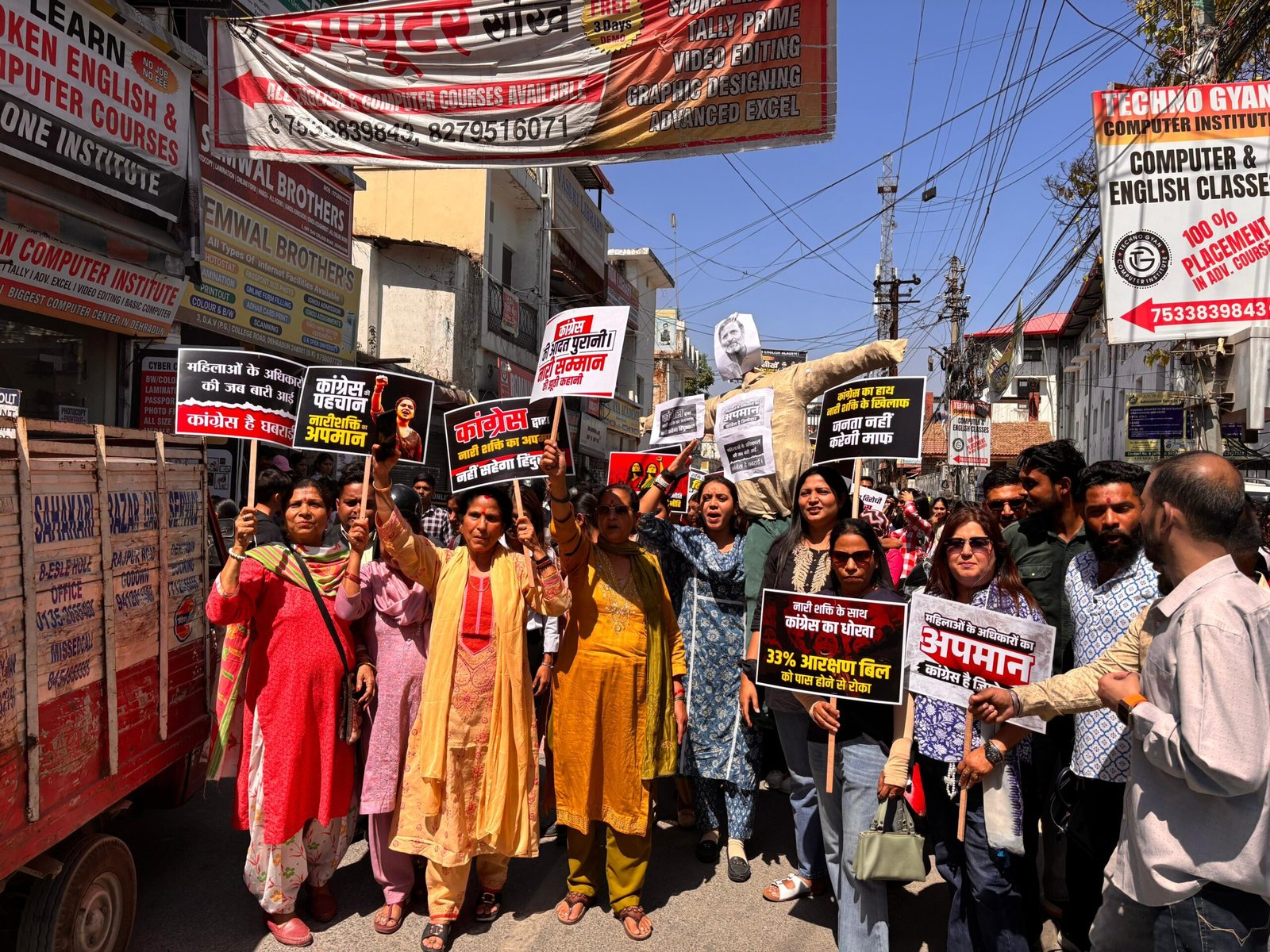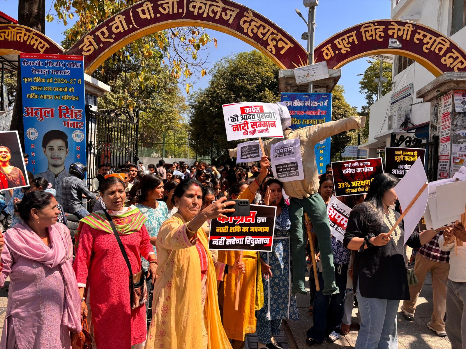 देहरादून।  संसद में विपक्षी सांसदों द्वारा ‘नारी शक्ति वंदन अधिनियम’ का समर्थन न किए जाने के तीव्र विरोध में आज डीएवी महाविद्यालय की छात्राओं एवं महिलाओं ने डीएवी कॉलेज चौक पर जोरदार प्रदर्शन किया।
