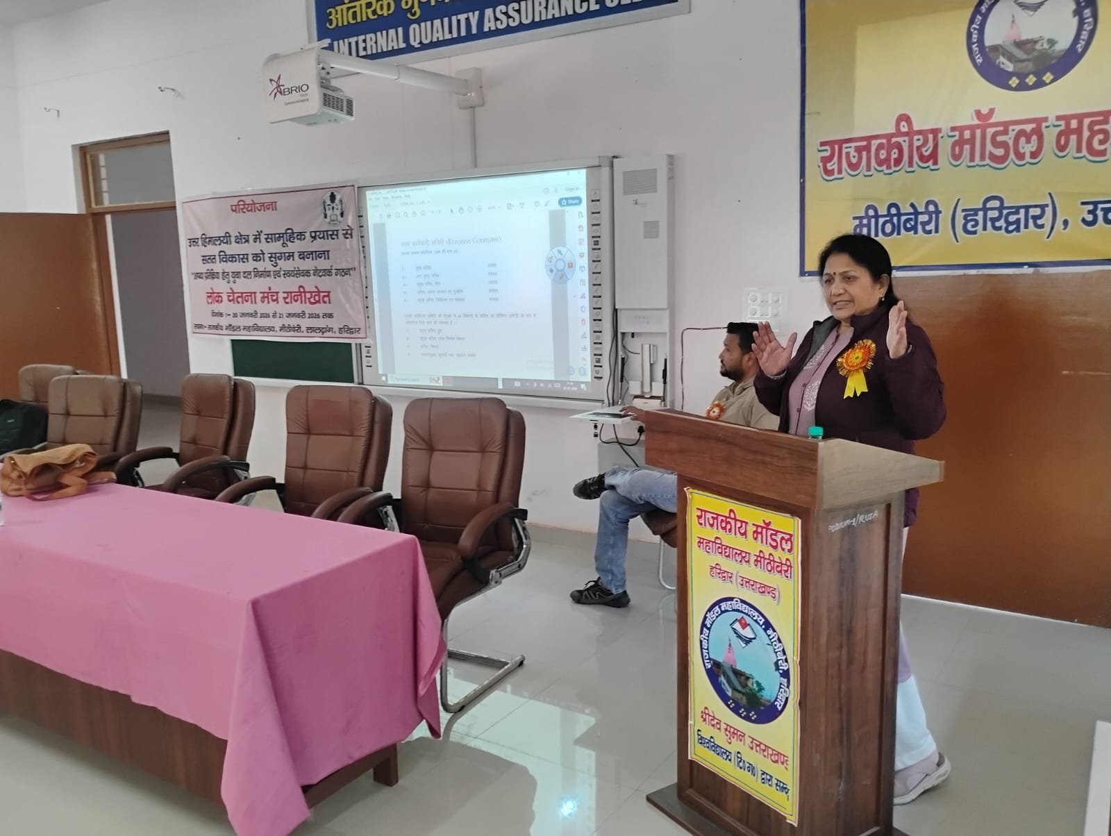 तत्पश्चात कार्यक्रम के प्रथम सत्र में मुख्य अतिथि श्रीमती मीरा रावत ने छात्र छात्राओं को आपदा प्रबंधन के बारे में जानकारी प्रदान करते हुए विभिन्न प्रकार के अधिनियमों से अवगत कराया।