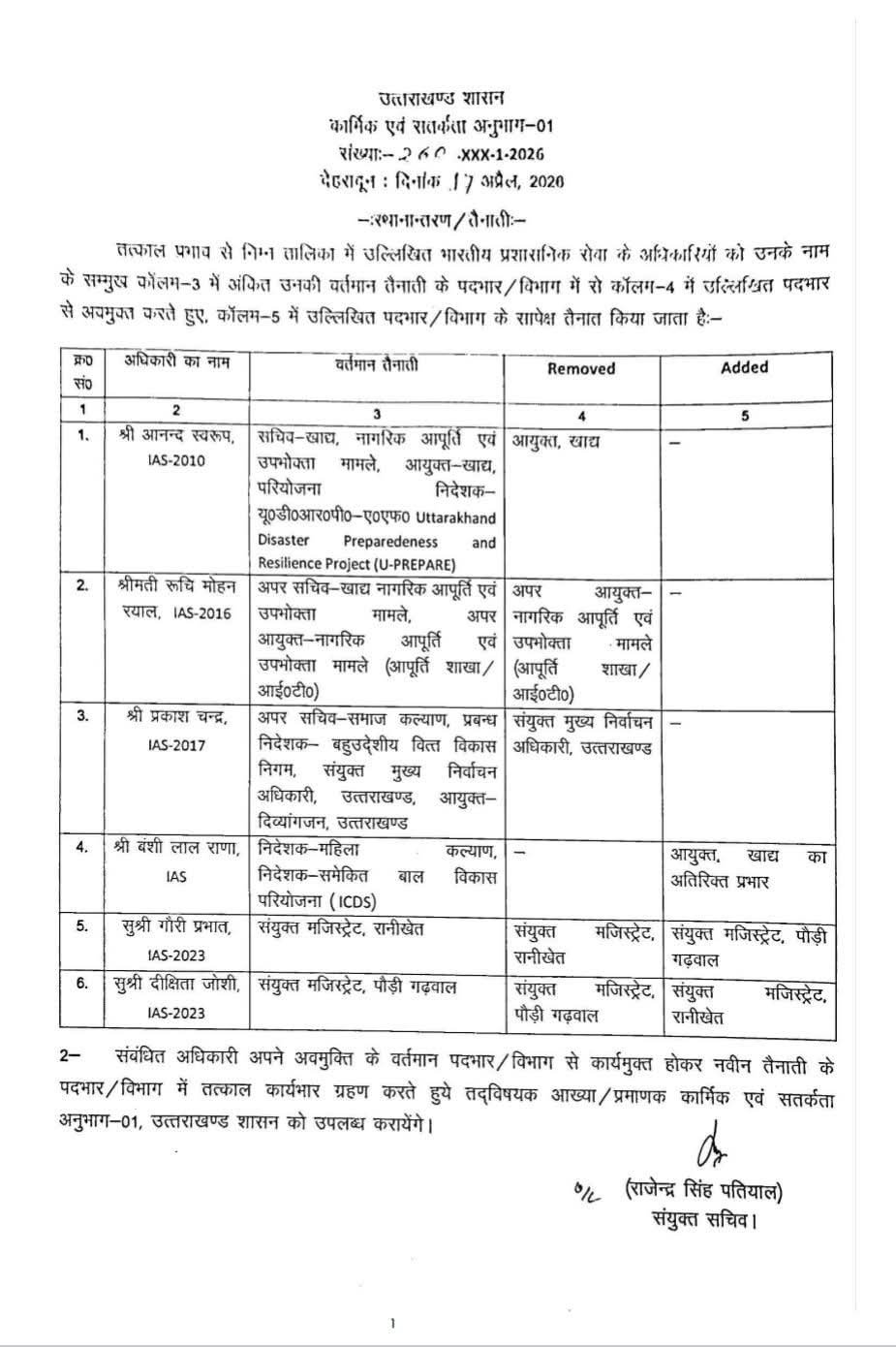 उत्तराखण्ड शासन कार्मिक एवं सतर्कता अनुभाग-01 संख्याः-260 XXX-1-2026 देहरादून: दिनांक 17 अप्रैल, 2020 – स्थानान्तरण/तैनातीः- तत्काल प्रभाव से
