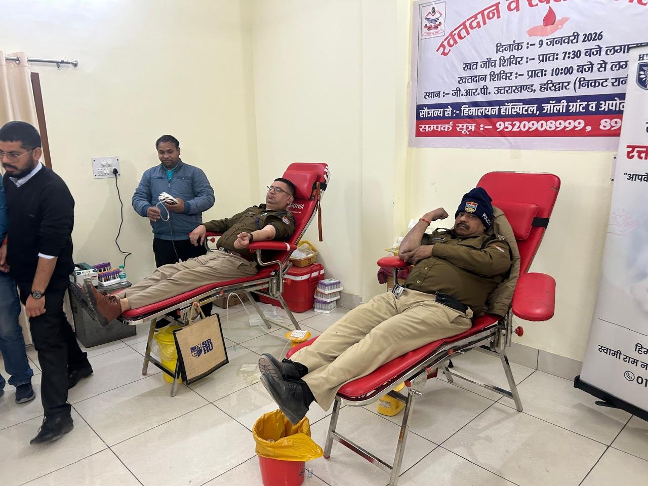 आज दिनांक 09/01/2026 को एस0पी0 जीआरपी अरुणा भारती के निर्देशन में पुलिस लाईन, जीआरपी हरिद्वार में *ब्लड बैंक हिमालयन हॉस्पिटल,स्वामी रामनगर ,जौलीग्रांट देहरादून व अपोलो डायग्नोस्टिक्स* की टीम द्वारा *रक्तदान/रक्तजांच शिविर* का आयोजन किया गया। जिसमें पुलिस अधीक्षक, रेलवेज द्वारा डाक्टरों की टीम को पुष्पगुच्छ देकर सम्मानित करनें के उपरान्त, जीआरपी लाईन/ जीआरपी हरिद्वार के समस्त थानें व ए0टी0सी0 हरिद्वार के लगभग 83 अधिकारियों व कर्म0गणों द्वारा हेल्थ चैकअप करा कर स्वेच्छिक रक्तदान कर 44 यूनिट ब्लड डोनेट किया गया।