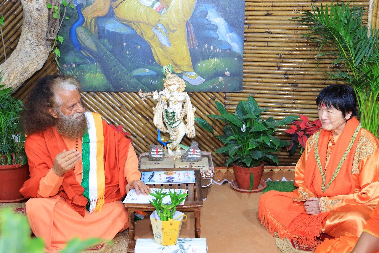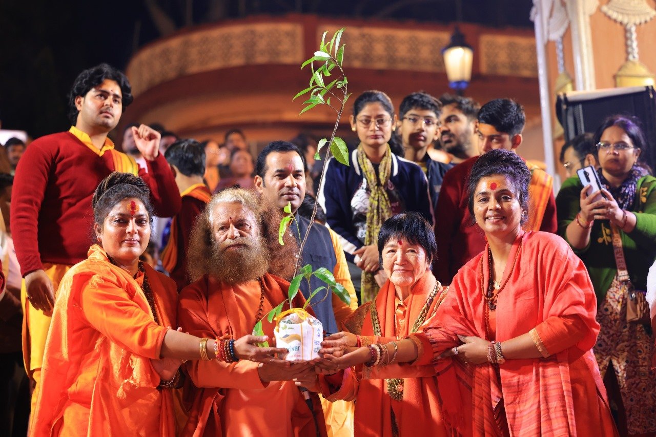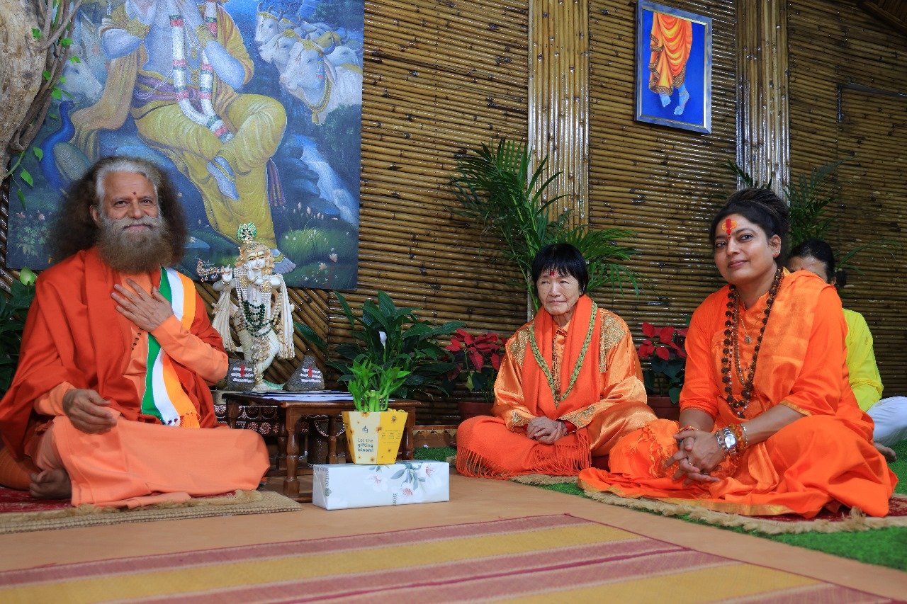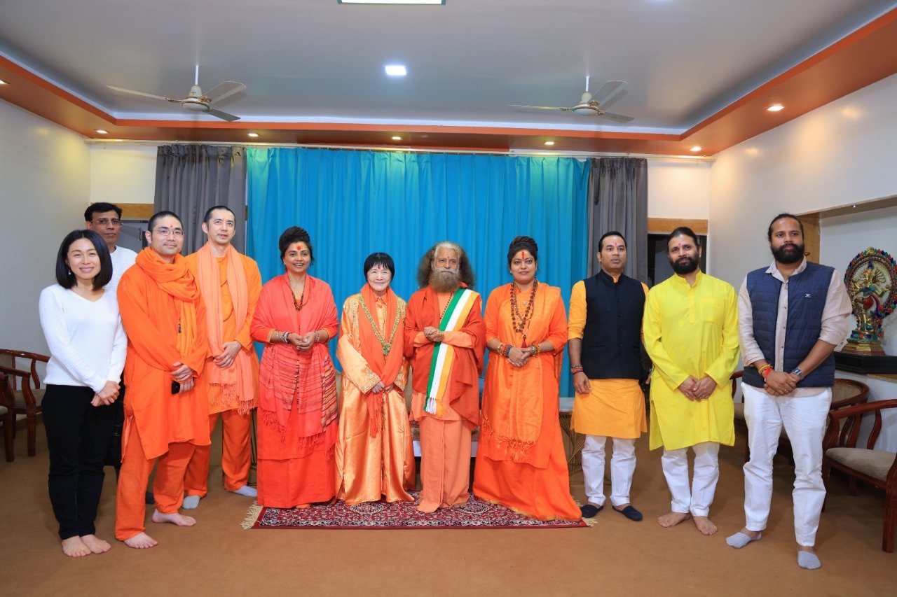स्वामी चिदानन्द सरस्वती जी ने योगमाता केको अइकावा जी और पायलट बाबा आश्रम से आये प्रतिनिधियों रूद्राक्ष का पौधा दे कर परमार्थ गंगा तट पर उनका अभिनन्दन किया।